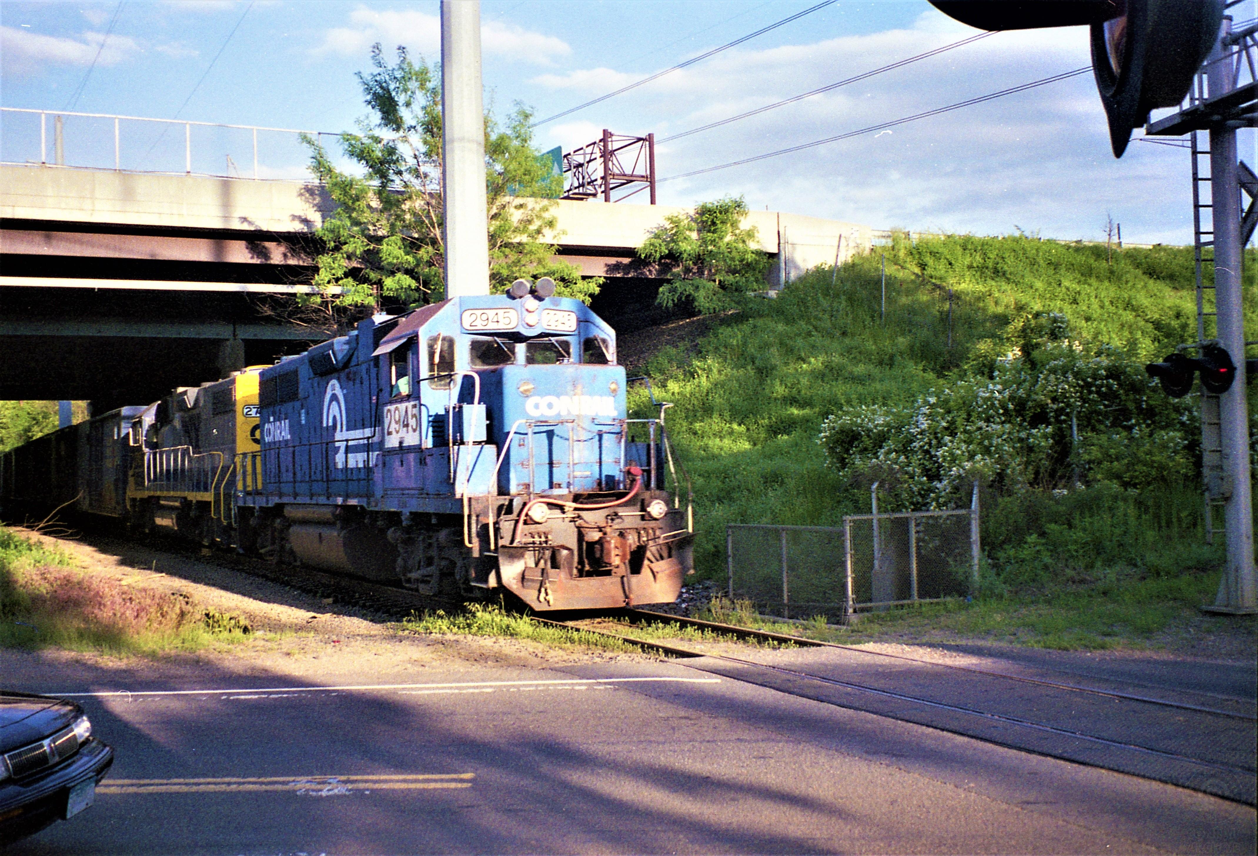 NS-CSX. Former PRR/PC and Conrail GP-38 #2945 & CSX GP38-2 #2745 on the South Amboy Secondary crossing Rt 535 (South River-Cranbury Road) at NJ Turnpike overpass in Monroe, NJ heading toward Monmouth Junction. There are many industries in this area in South Brunswick, NJ so they are switching the locations on the 2nd trick out of Brown's Yard in Old Bridge, NJ. The freight has already passed through Jamesburg, NJ. Photo was taken in the late afternoon sun in September 2001. Taken with my Vivitar "point & shoot" camera, so the quality is not the best.
