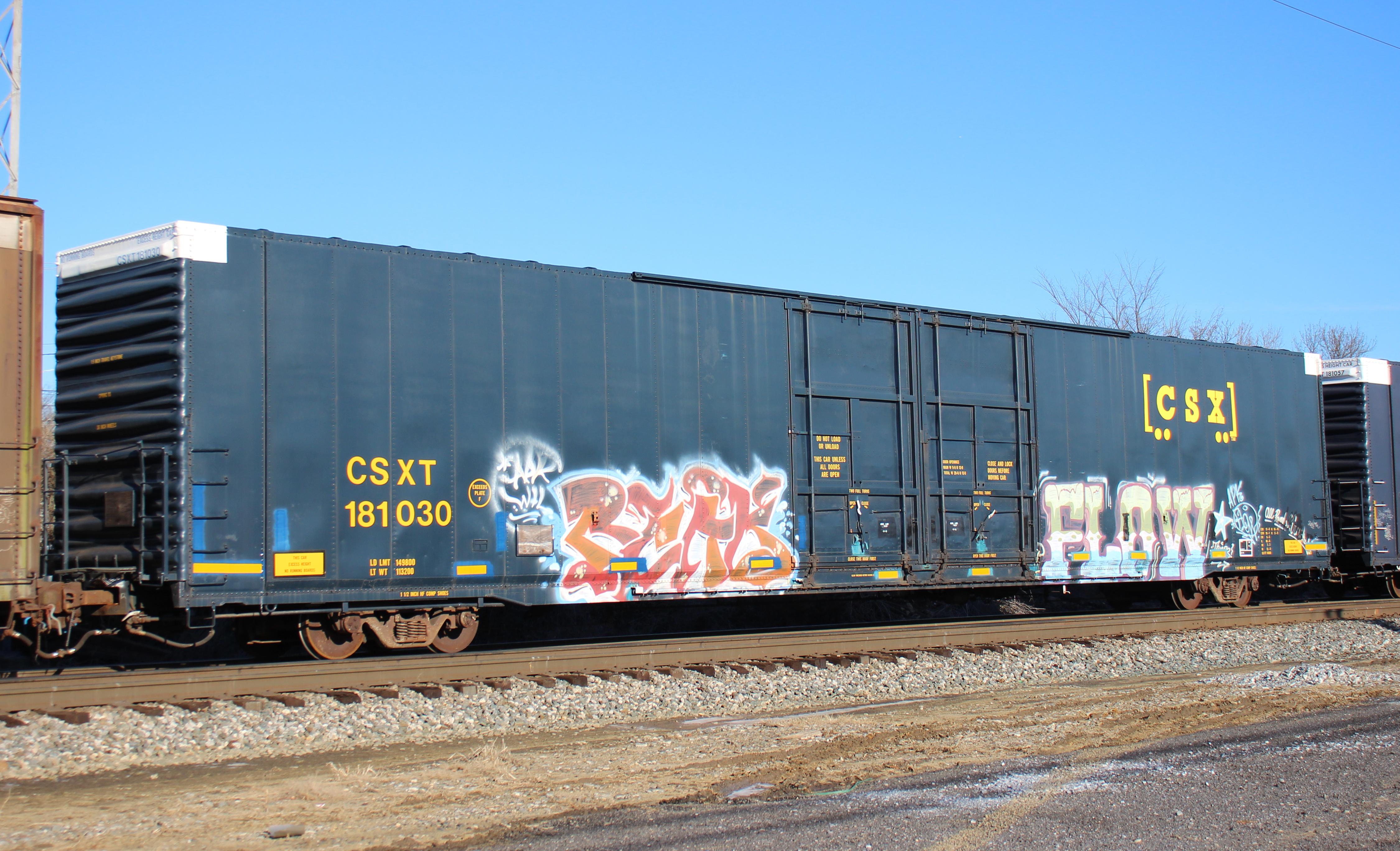 CSXT 181030is seen in the consist of CSX Q410-04at Elsmere, DE on 2/6/22. Car is ex NYC 297655/CR 297655 and was built 4-78by Greenville Steel Car.