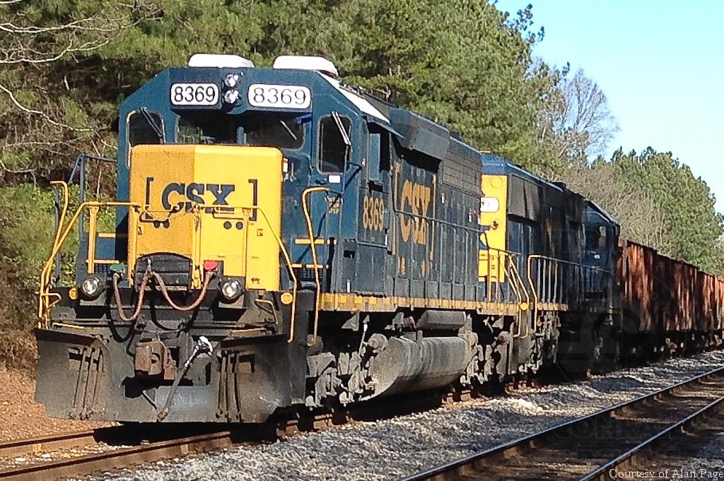 CSXT SD40-2 8369 (ex-C&O 7510) and SD50-2 2493 (CSX 8670/CR 6760) wait for clearance with a line of hoppers at mile 835 in Tyrone, GA on February 8, 2015.