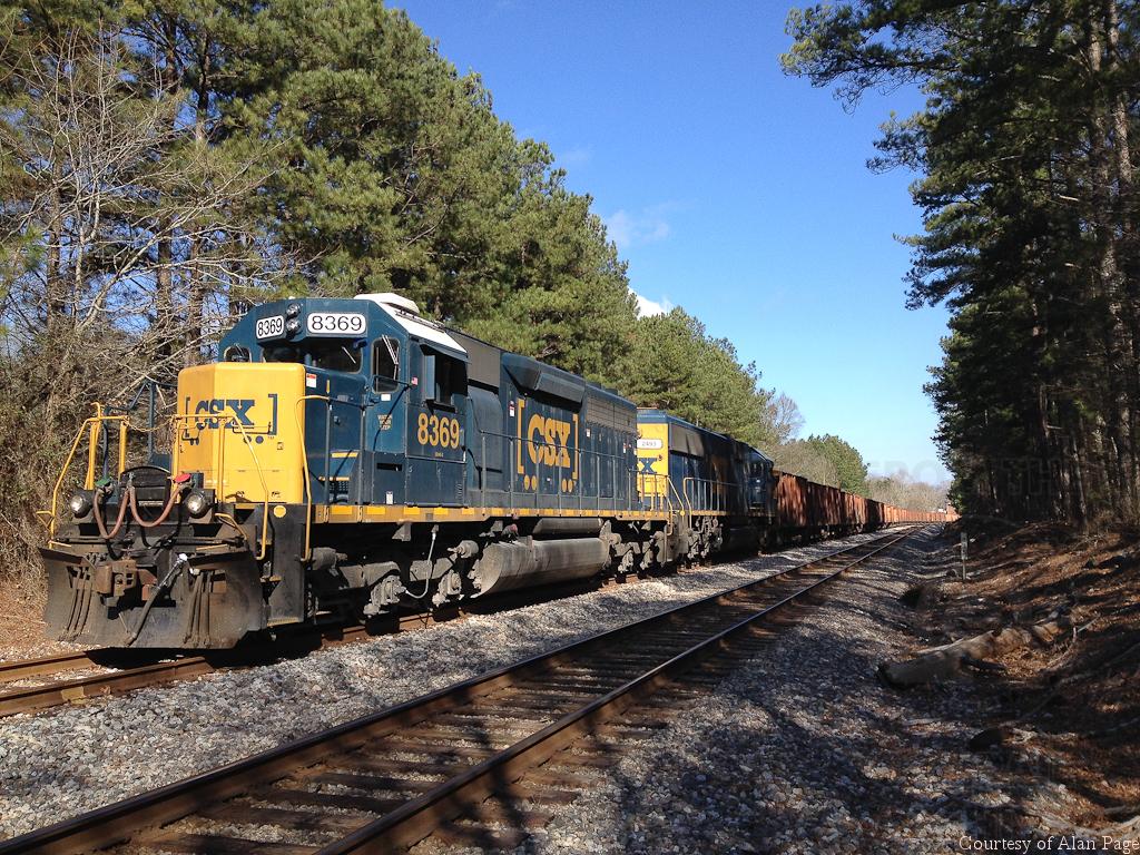 CSXT SD40-2 8369 (ex-C&O 7510) and SD50-2 2493 (CSX 8670/CR 6760) wait for clearance with a line of hoppers at mile 835 in Tyrone, GA on February 8, 2015.