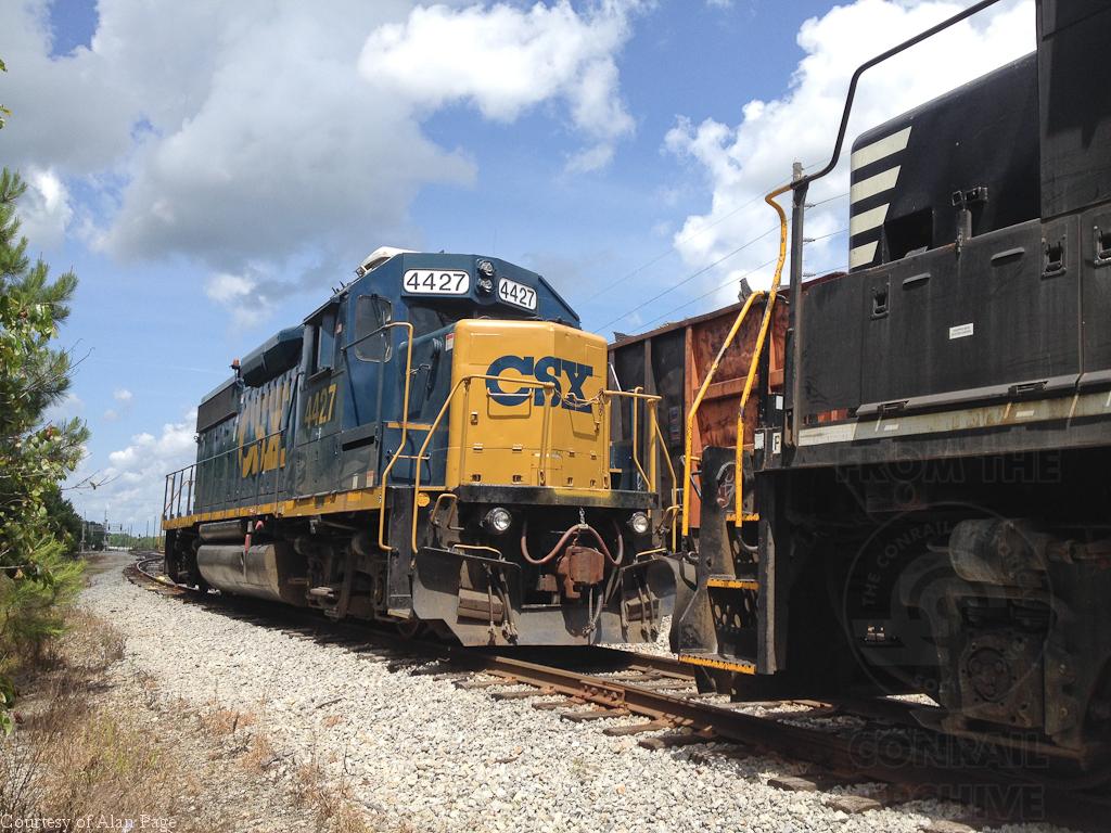 CSXT reclassed GP38-2S 4427 (CR GP40-2 3343) rests on a Sunday layover with FURX GP38-2 5573 at Fairburn, GA on May 31, 2015.