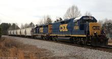 CSXT GP40-2 6965 (CSX 4438/CR 3366) and mate 2365 (CSX rebuilt GP40 9724/B&O 4036) pull a local through Tyrone, GA on January 29, 2015.