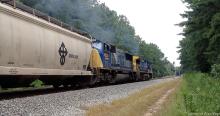 Previous Next CSXT C40-8W 7361 (CR 6201) and SD70AC 4524 pound a load of mixed freight northbound past N.E. Aberdeen signal in Tyrone, GA on August 2, 2014. Photo By Alan Page Location Details N.E. Aberdeen ANB - 382.17 Equipment Type GE C40-8W Conrail Number 6201 Post Conrail Owner CSX Post Conrail Number CSX 7361 Year 2014 Original Date 8/2/14 Collection CRHS Conrail Photo Archive Contributions