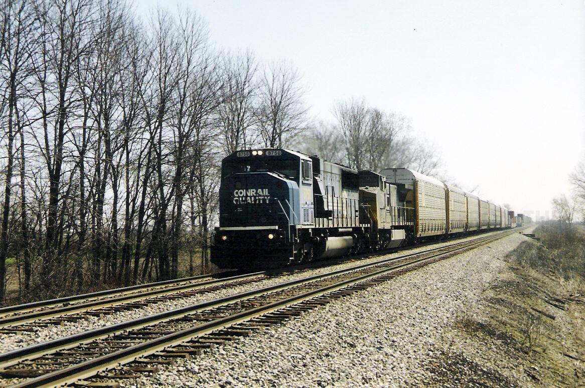 Former Conrail 5642(CSXT 8750) leads Q159 just east of Deshler, OH at Roundhead Road crossing back in the spring of 2004