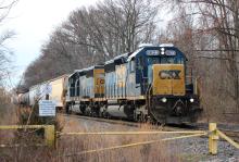 A pair of former CR SD40-2s, CSXT 8823 (CR 6420) & CSXT 8828 (CR 6431), are seen leading CSAO CA-11 North at Bridgeport, NJ on 1/2/20.