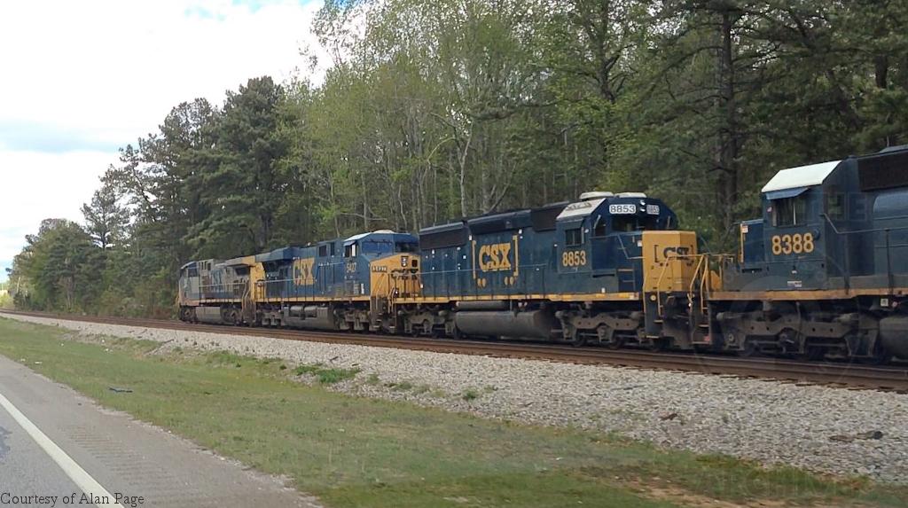 CSXT AC44CW 301, ES40DC 5427, SD40-2 8853 (CR 6494), and SD40-2 8388 roll through Fairburn on April 6, 2017.