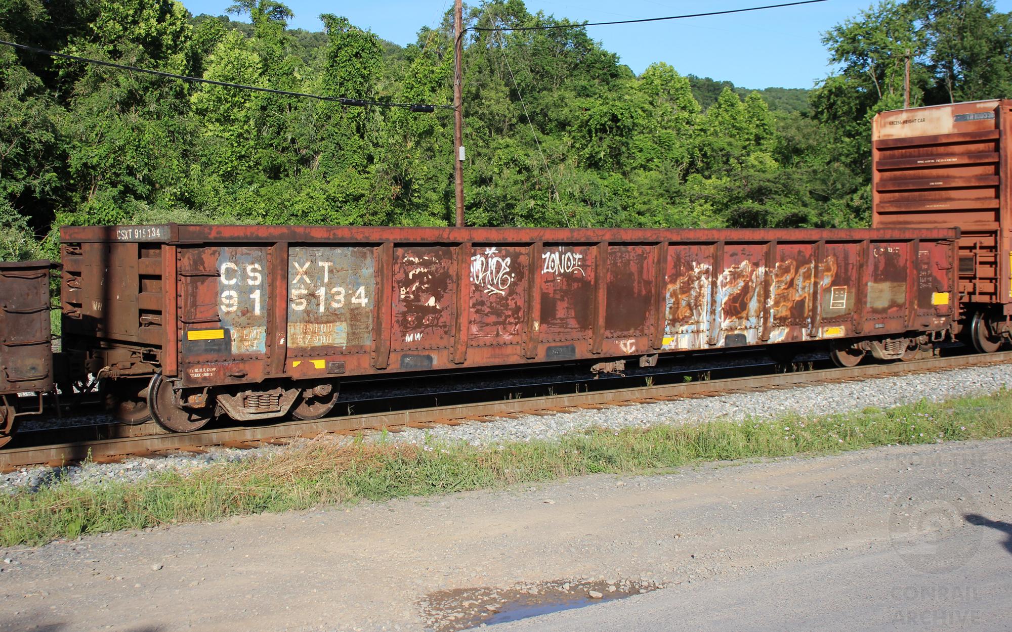 CSXT 915134 is seen in the consist of CSX D721-23 at North Branch, MD on 6/23/21. Car is ex NYC 588494/CR 588494/CR 578551/PC 578551/PRR 387727and was built 11-66as a PRRG43class gon.
