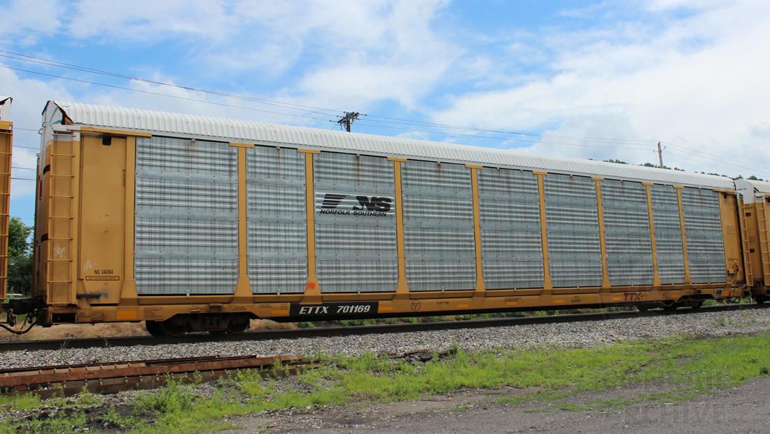 ETTX 701169 is seen in the consist of CSX Q296-14 at Cumberland, MD on 6/17/16. Rack was built as CR 7127,a ML3N class rack, in 3-89 and was rebuilt, repainted and renumbered to NS 34084 in 10-13. Rack is now class FT640 by NS.
