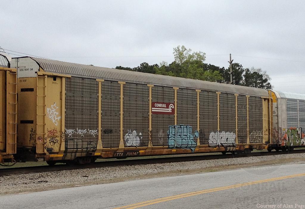 CSXT C40-8W 7363 (CR 6204) and ES40DC 5435 lead a line of autoracks, including ETTX 701247, through Union City, GA on March 21, 2015.