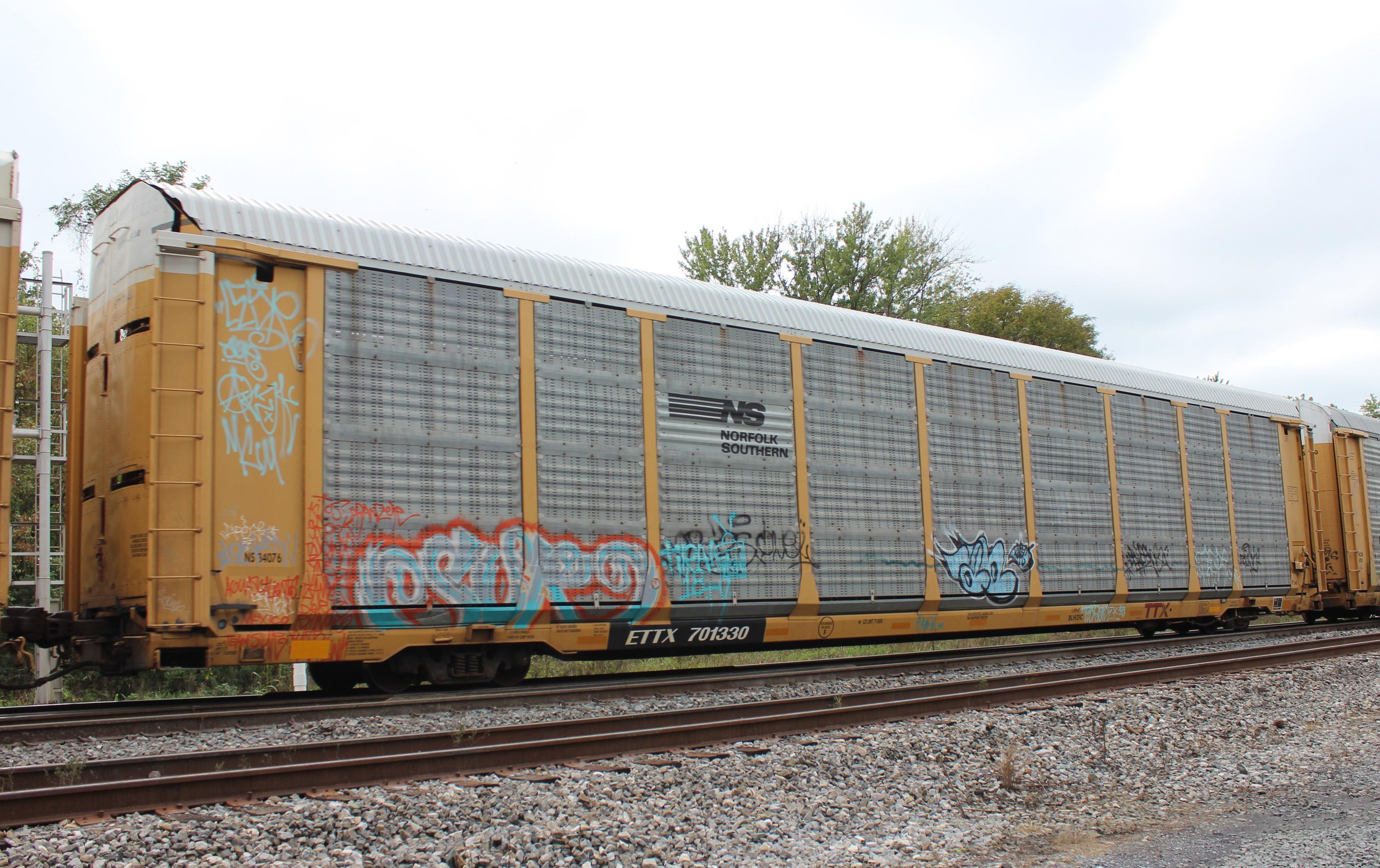 ETTX 701330 is seen in the consist of CSX Q277-14 at Point of Rocks, MD on 10/14/17. Rack was built as CR 7276, a CR ML3N class rack, in 4-89 and was then rebuilt, repainted and renumbered to NS 34076 in 5-12. Rack is now classed FT640 by NS.