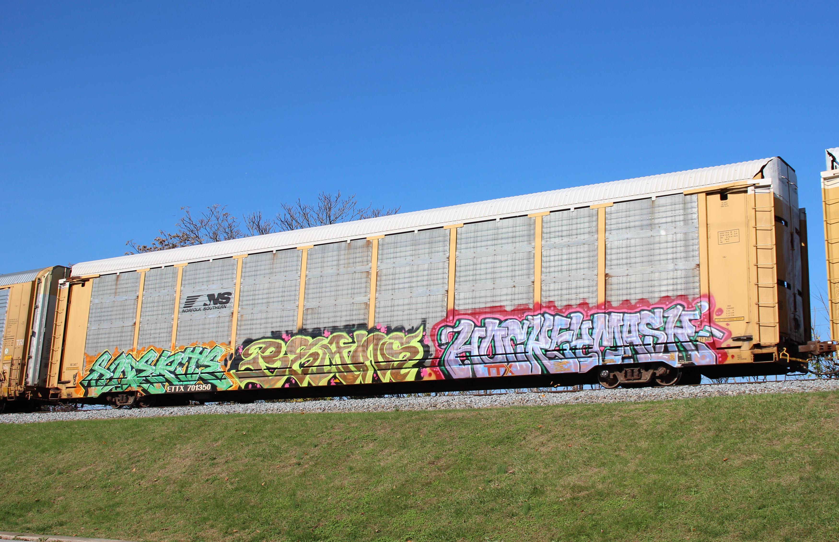 ETTX 701350is seen in the consist of CSX Q216-11at Newark, DE on 11/14/20. Rack was built as CR 7312, a CR ML2L class rack, in 4-89. It was then rebuilt, repainted and renumbered to NS 34817 in 4-14. Rack is now classed FT640 by NS. I have now photographed this rack in CR & NS paint.