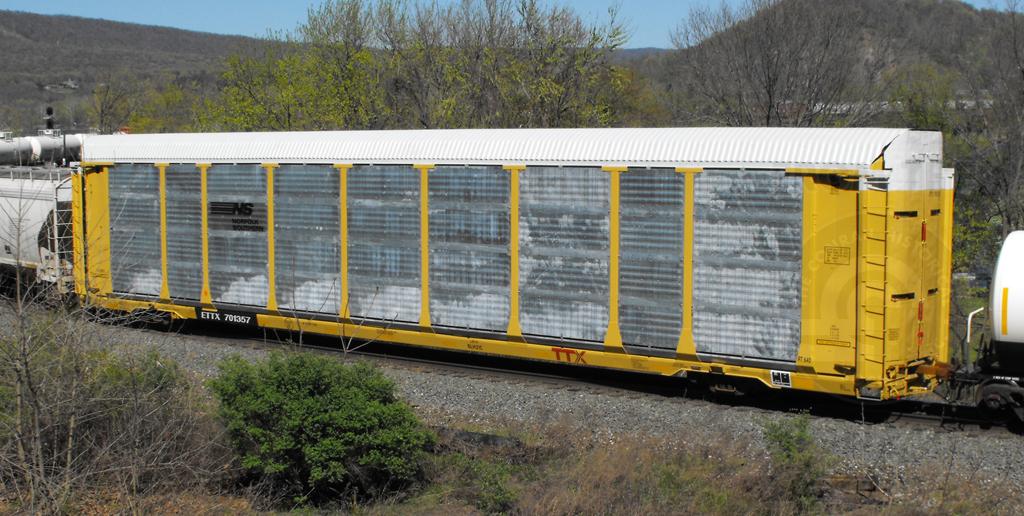 ETTX 701357 is seen in NS paint on 34A at Marysville PA on 4/7/12. Rack was built as CR 7345, a ML3N class in 4-89 and was rebuilt, repainted, and renumbered NS 33919 in 4-12.
