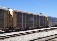 CSX SD40-2 8060, SD50-2 8666, and UP ES44AC 7413 pull a load of autoracks, including ETTX tri-level 701730, through the Fairburn, GA sorting yard in March 2014.