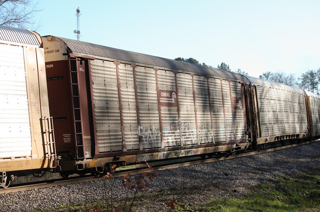 A line of autoracks including ETTX 701374 (CR 7338) rolls through Union City, GA on December 15, 2015.