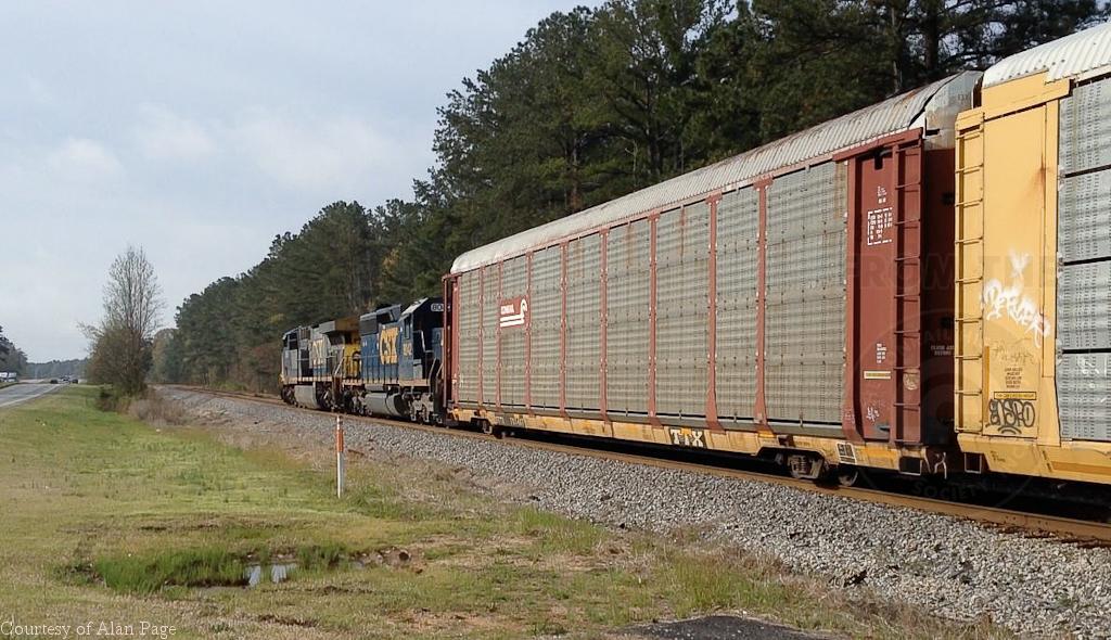CSXT CW60AC 659 and SD40-2 8042 lead ETTX 701467 (CR ML3N rack 7411) and a line of autoracks southbound at Peachtree City, GA on April 3, 2014.