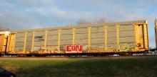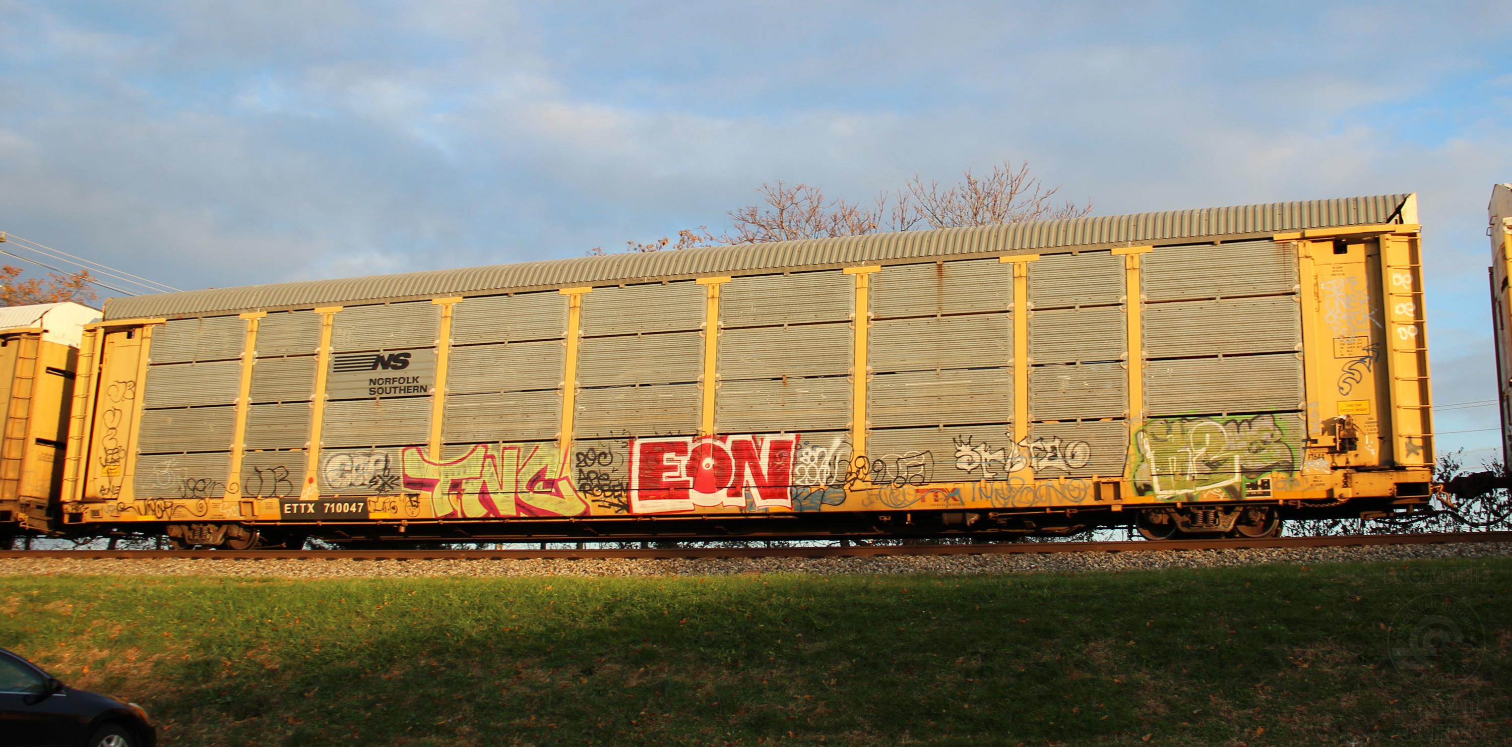 ETTX 710047 is seen in the consist of CSX L276-14 at Newark, DE on 11/17/18. Rack was built as a unknown CR ML3T class standard height rack in 1-95. Then rebuilt by CR to 20'2" rack and classed ML3W in 1998. The rack was then rebuilt back to a standard height rack in 5-08 and numbered to NS 33604. Note the weld line near the top of the rack were the roof was welded back to the rack.