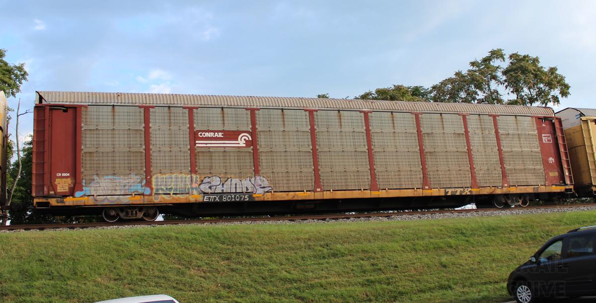 ETTX 801075 is seen in the consist of CSX Q217-09 at Newark, DE on 10/9/15. Rack number is CR 6904, built 1-89, rebuilt 10-97 and is now owned by NS.