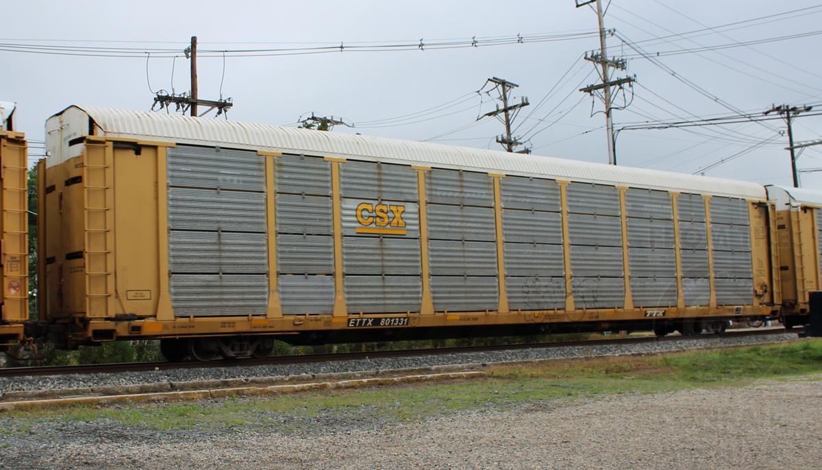 ETTX 801331 is seen in CSX paint in the consist of CSX Q217-15 at Newark, DE on 7/15/14. Rack number is CR 3532, built 7-86, rebuilt and repainted CSX in 9-06.