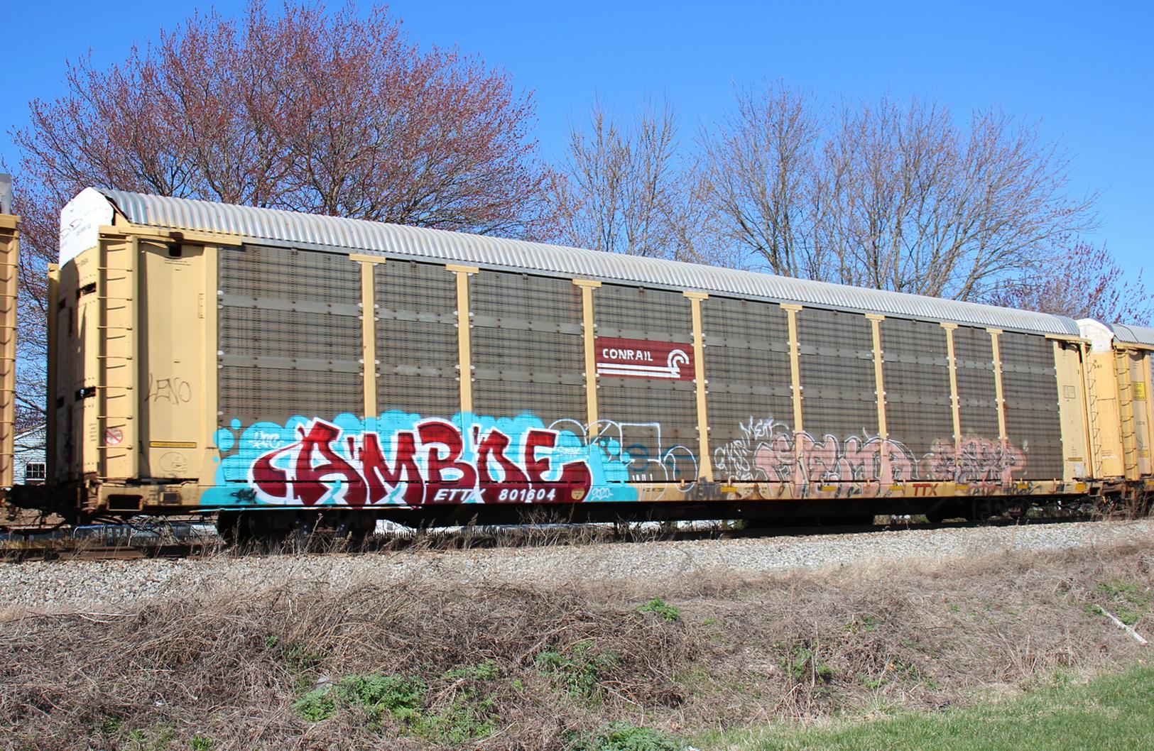 ETTX 801604 is seen in the consist of CSX Q216-19 at Newark, DE on 3/21/20. Rack number is CR 8655, built 12-89, rebuilt 9-98, and is now owned by NS.