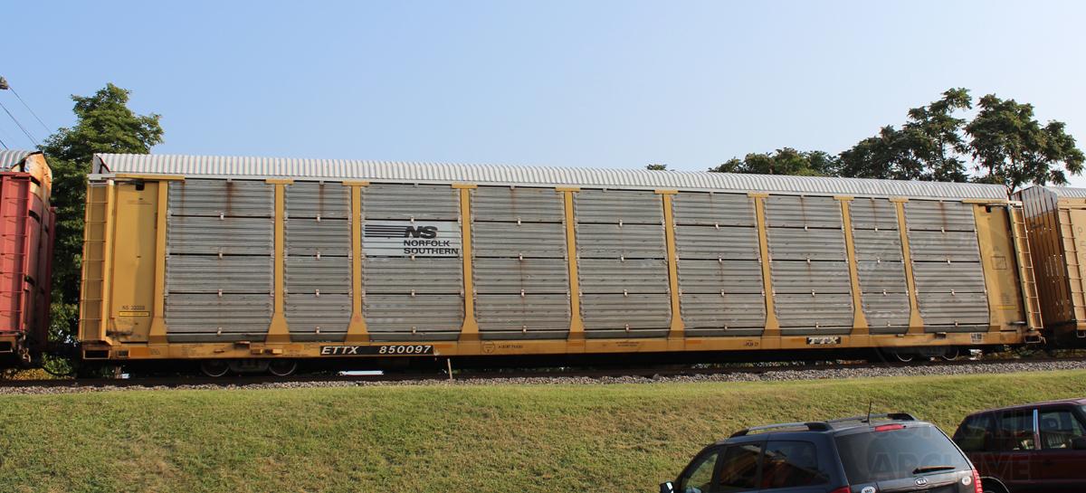 ETTX 850097 is seen in the consist of CSX Q217-04 at Newark, DE. Rack was built as CR 8880, a CR ML3R class rack, in 3-90 and was rebuilt, repainted and renumbered to NS 33328 in 6-07. Rack is now classed FT643 by NS.