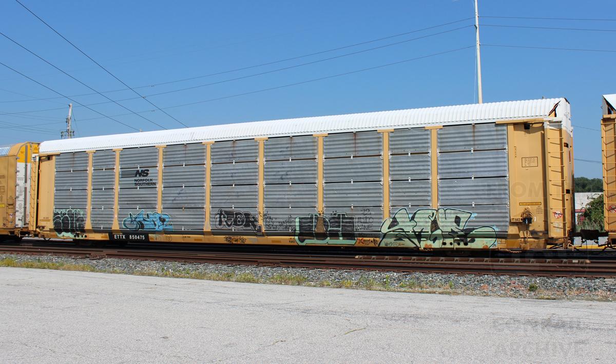 ETTX 850475 is seen in the consist of CSX L216-15 at Elsmere, DE on 8/19/14. Rack was built as CR 8918, a CR ML3R class rack, in 4-90 then rebuilt, repainted and renumbered to NS 33423 in 9-08. Rack is now classed FT643 by NS.