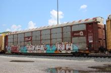 ETTX 852937 is seen in the consist of CSX L348-07 at Cumberland, MD on 7/8/20. Rack number is CR 6148, built 6-88 and is now owned by NS. Photo by Chris Carangi.
