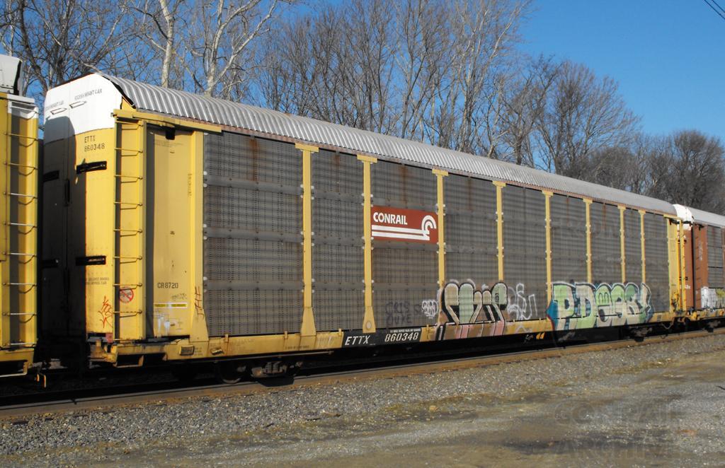 ETTX 860348 is seen on D757-17 at Feltonville PA on 2/17/12. Rack number is CR 8720, built 2-90, rebuilt and repainted yellow 1-99 and is now owned by CSX.