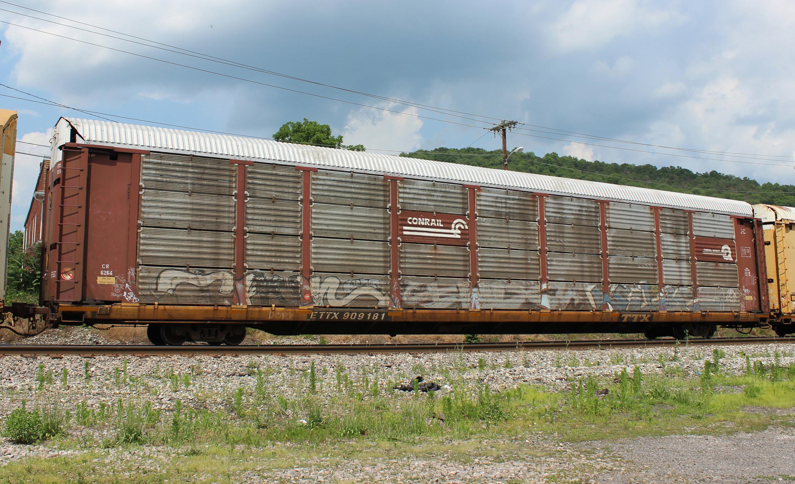 ETTX 909181 is seen in the consist of CSX Q217-14 at Cumberland, MD on 6/14/17. Rack number is CR 6264, built 8-88 and is now owned by NS.
