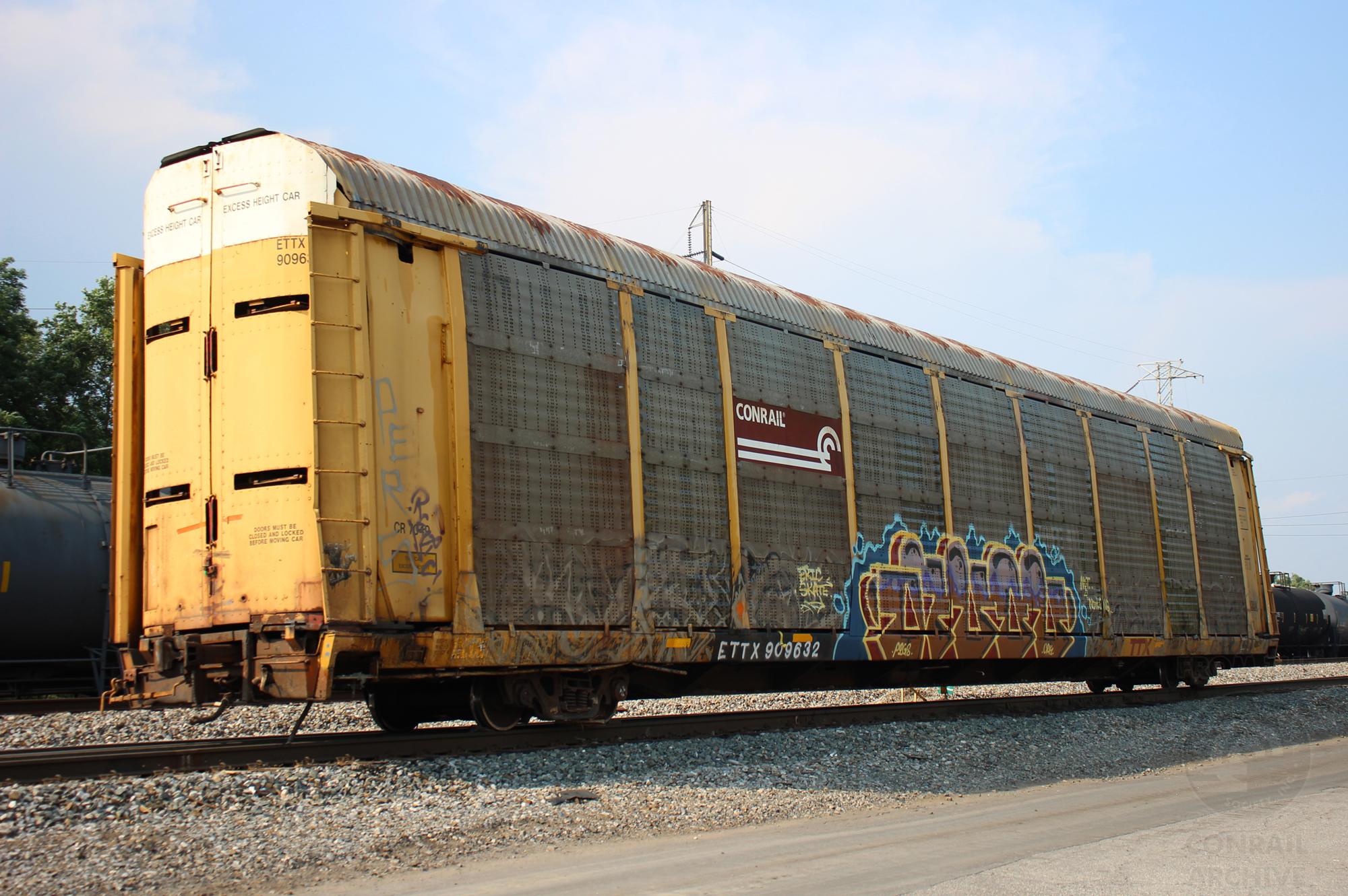 ETTX 909632 is seen at Elsmere, DE on 7/6/21. Rack number is CR 7049, built 3-89, rebuilt 6-98 and is now owned by CSX. Note the damage along the top of the rack as the car derailed here the day before and rolled onto it's side.