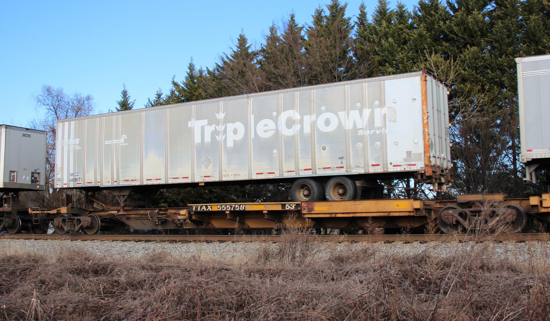 MECZ 461671 is seen in the the consist of Q031-26 at Newark, DE on 1/26/20. Trailer is ex TCSZ 461671.