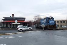 A GP15-1 in CRQ paint leads NS H47 (CR WPRE10) past the old Reading station in Topton, PA in January 2007. This engine is nearing the end of its Class I life. By the end of the month this and all of the other GP15-1s would be off the active roster. Out of view on the other end of the train is an SW1500 also in Conrail blue.
