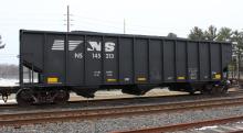 NS 145213 is seen at Deepwater, NJ on 3/1/15. Car was re-bodied from CR 496701 in Oct of 2013 by Freight Car America in Roanoke, VA. CR 496701 was built 9-94 by HCS as a H2 class 4 bay hopper. Car is stenciled being built 6-94, which is incorrect.