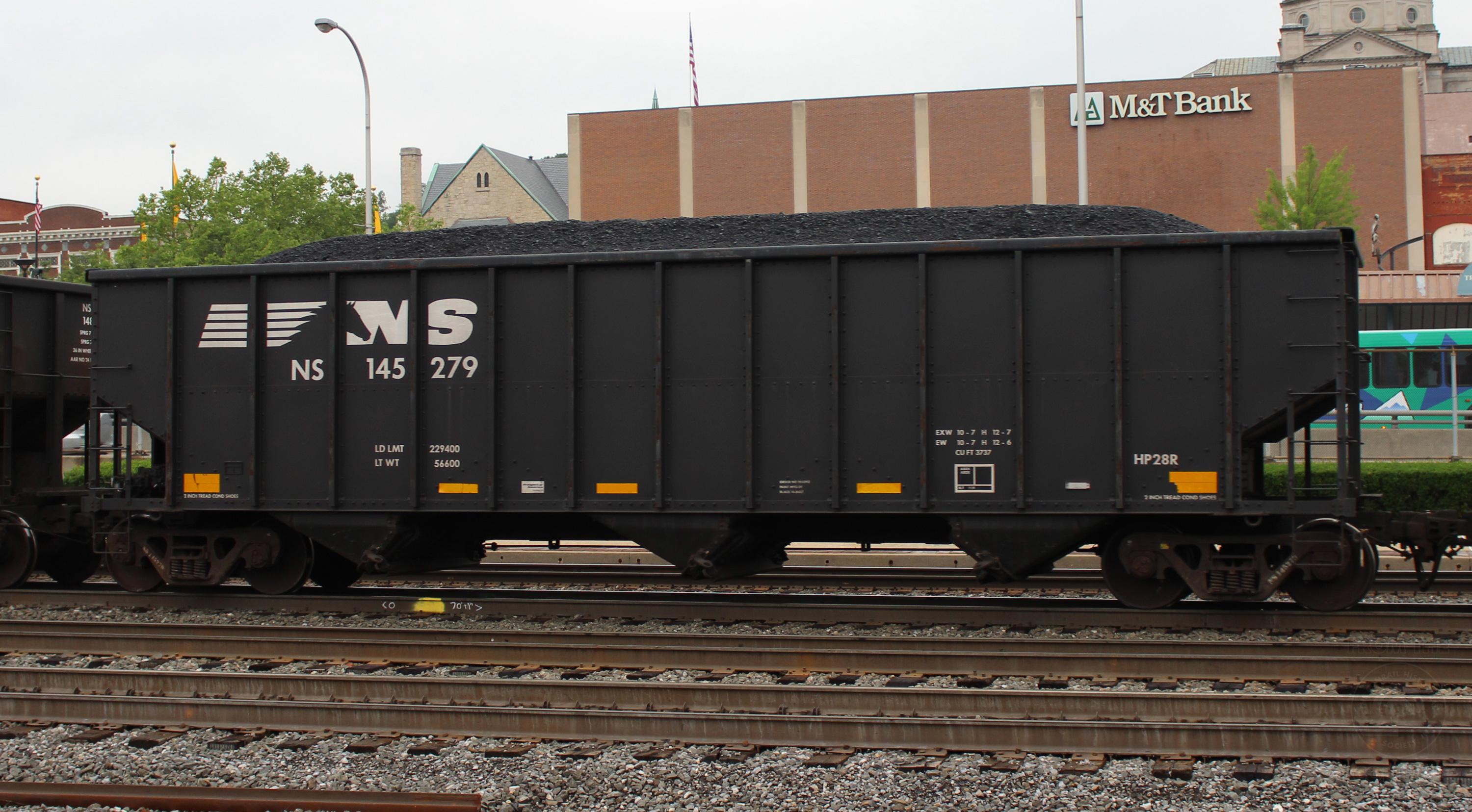 NS 145279 is seen in the consist of 510 at Altoona, PA on 6/16/16. Car is ex CR 497089, built 11-94 and was re-bodied 6-13 by FCA at Roanoke, VA.