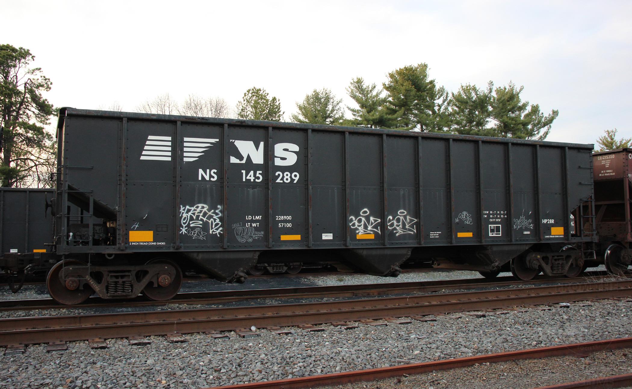 NS 145172 is seen at Deepwater, NJ on 4/6/18. Car was built as CR 496285, a CR H2 class hopper, in 8-94. Then was re-bodied and renumbered to NS 145289 in 6-13 by FCA at Roanoke, VA. Car is now classed HP28R by NS.