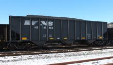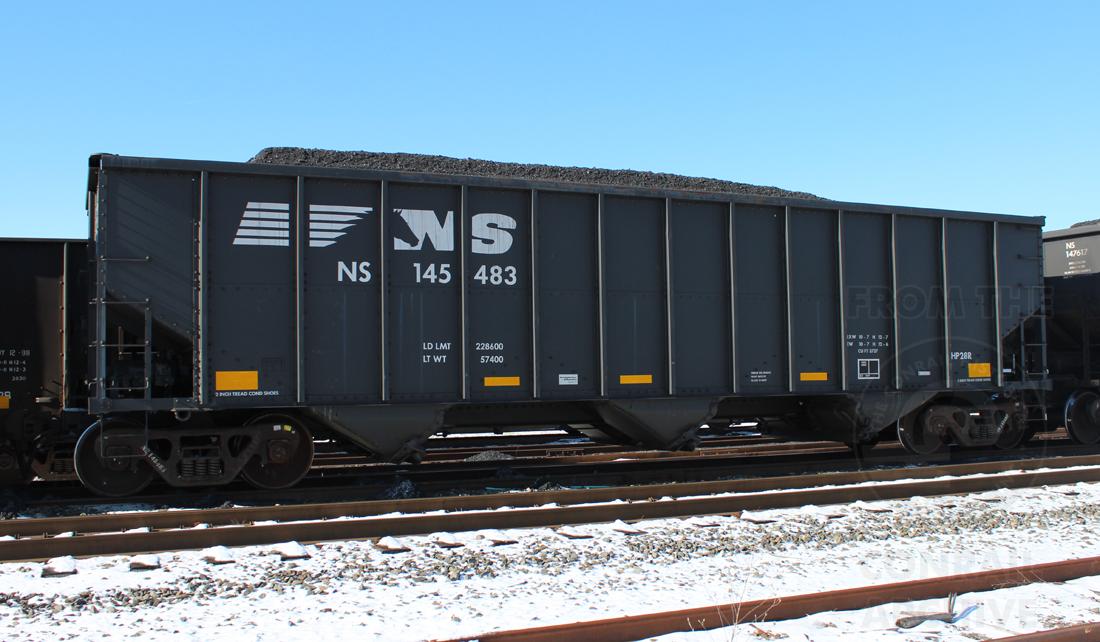 NS 145483 is seen at Deepwater, NJ on 1/4/15. Car was re-bodied from CR 496096 in Sept of 2013 by Freight Car America in Roanoke, VA. CR 496096 was built 6-94 by HCS as a H2 class 4 bay hopper.