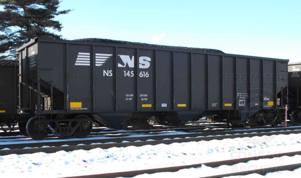 NS 145616 is seen at Deepwater, NJ on 12/12/13. Car was re-bodied from CR 498177 in June of 2013 by Freight Car America in Roanoke, VA. CR 498177 was built 5-95 by HCS as a H2B class 4 bay hopper. Car is stenciled as being built 9-98, which is incorrect.
