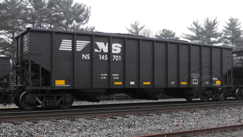 NS 145701 is seen at Deepwater, NJ on 1/10/14. Car was re-bodied from CR 498025 in July of 2013 by Freight Car America in Roanoke, VA. CR 498025 was built 4-95 by HCS as a H2B class 4 bay hopper.