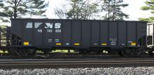 NS 145858 is seen at Deepwater, NJ on 4/16/14. Car was re-bodied from CR 497663 in Sept of 2013 by Freight Car America in Roanoke, VA. CR 497663 was built 2-95 by HCS as a H2B class 4 bay hopper.