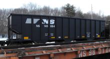 NS 145884 is seen at Deepwater, NJ on 2/14/14. Car was re-bodied from CR 497521 in Sept of 2013 by Freight Car America in Roanoke, VA. CR 497521 was built 1-95 by HCS as a H2 class 4 bay hopper. Car is missclassed as a HP29R as the former CR H2 class hoppers that were rebodied became HP28R on NS.