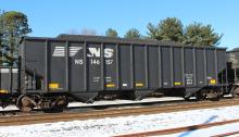 NS 146157 is seen at Deepwater, NJ on 1/4/15. Car was re-bodied from CR 498882 in Dec of 2013 by Freight Car America in Roanoke, VA. CR 498882 was built 8-98 by HCS as a H2C class 4 bay hopper.