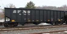 NS 146213 is seen at Deepwater, NJ on 3/1/15. Car was re-bodied from CR 498757 in Nov of 2013 by Freight Car America in Roanoke, VA. CR 498757 was built 7-98 by HCS as a H2C class 4 bay hopper.
