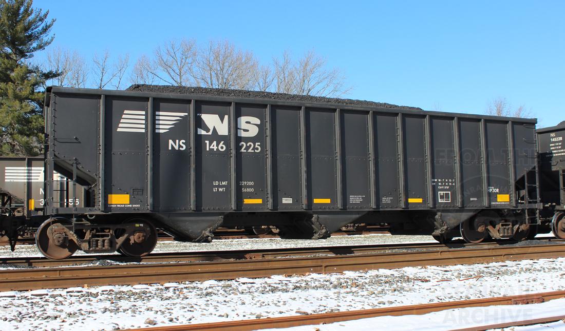 NS 146225 is seen at Deepwater, NJ on 1/4/15. Car was re-bodied from CR 498841 in Nov of 2013 by Freight Car America in Roanoke, VA. CR 498841 was built 7-98 by HCS as a H2C class 4 bay hopper.