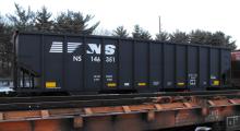 NS 146351 is seen at Deepwater, NJ on 2/14/14. Car was re-bodied from CR 499002 in July of 2013 by Freight Car America in Roanoke, VA. CR 499002 was built 9-98 by HCS as a H2C class 4 bay hopper.