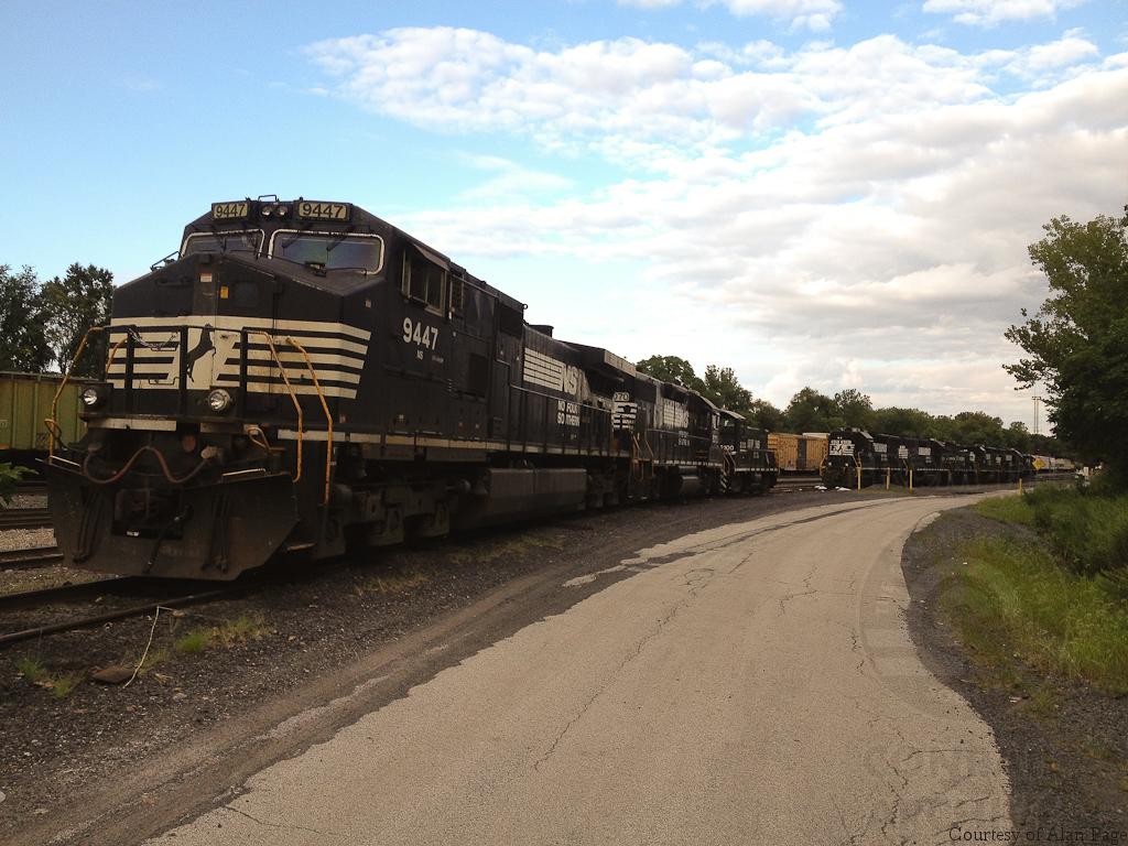 NS C40-9W 9447, ex-SR GP38-2 5070, and SW1001 2100 (CR 9400/RDG 2625) line up at Abrams on August 24, 2014, along with NS 5121, 5171, 2353, 5210, and 5309 (CR 8126) in the background.