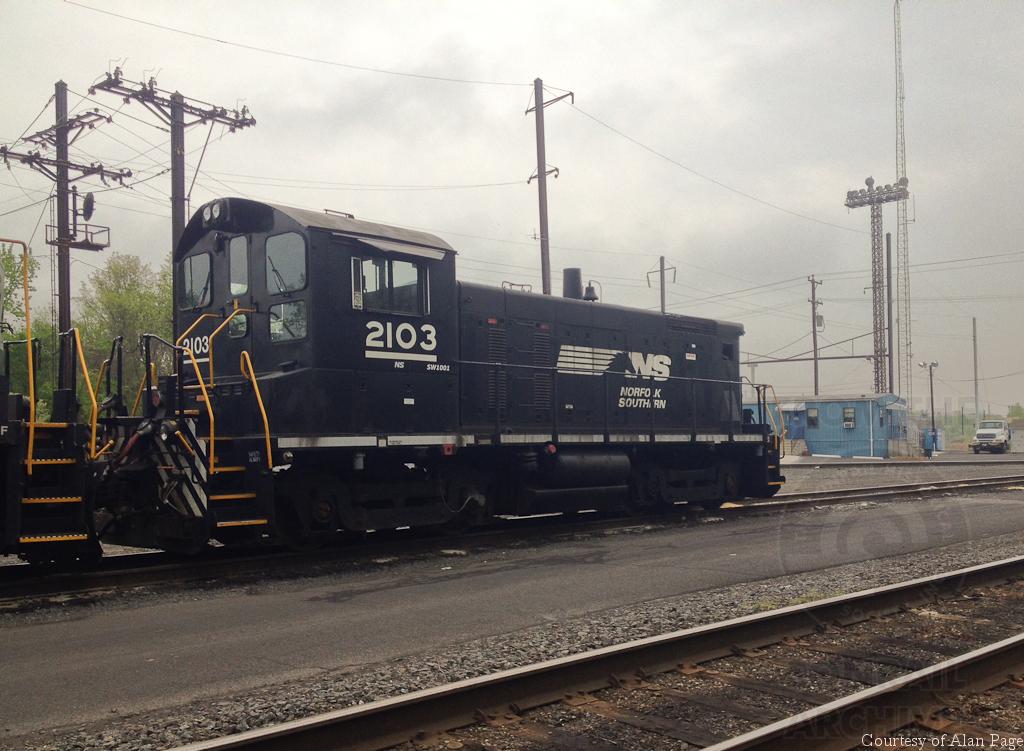 All former Conrail units lineup at Morrisville on May 10, 2014 with NS GP38-2's 5284 and 5312 (CR 8083 and 8129) and SW1001 2103 (CR 9413/RDG 2613).