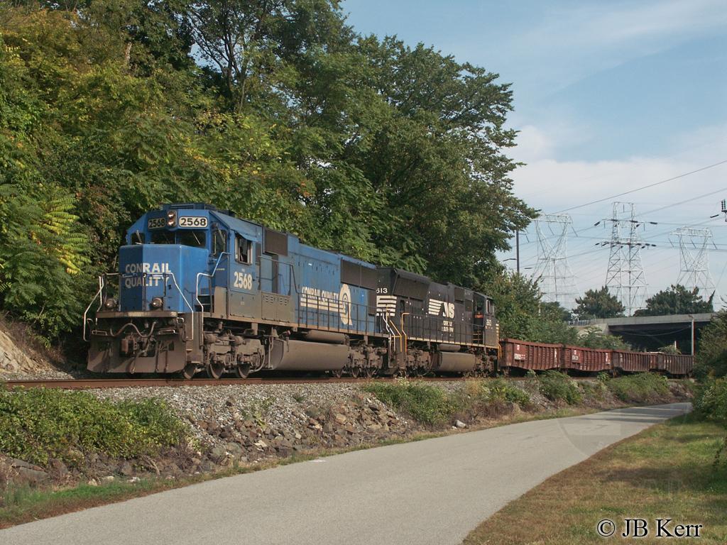 Former Conrail SD70 2568 is seen pulling a loaded 67Z steel slab train west through Norristown, PA on 9/26/2004
