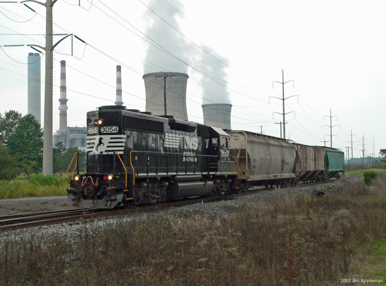 Ex-CR 3377 NS 3054 GP40-2 with H45 local.out of Northumberland Yard heads east with cars from Foreman's Grain on the Watsontown Secondary to the runaround on the Watsontown Industrial Track past PPL's Montour Power Plant.