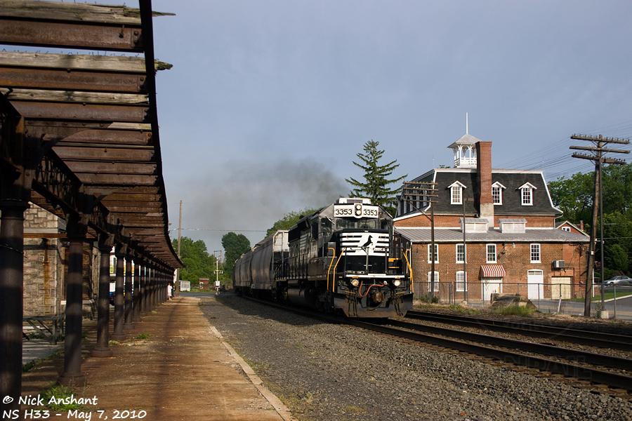 A lone NS SD40-2 works to keep this Reading-based local at track speed past the ex-Reading Company station in Wernersville, PA. Trailing on the other end of this push-pull job is NS SD60 6712 (ex-CR 6858).