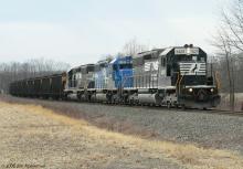 NS 536 "Ridge" train with 3 ex-CR SD40-2s is within sight of the gate to its destination of PPL Montour Power Plant.