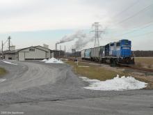 H44 local out of Northumberland Yard has picked up 3 empty fertilizer hoppers from Crop Production Services at M.P. 14 at the end of the Watsontown Industrial Track and heads west to couple up to the rest of the train left at Strawberry Ridge.
